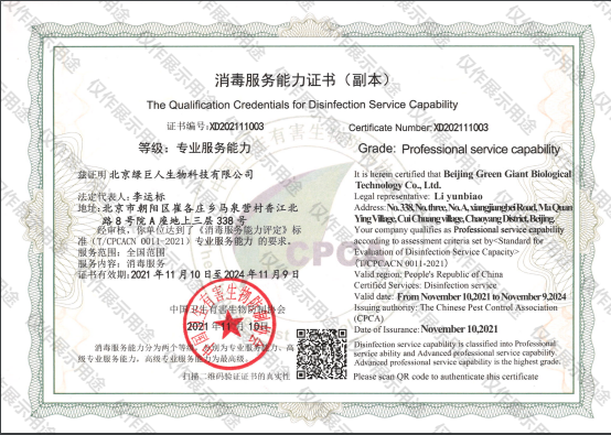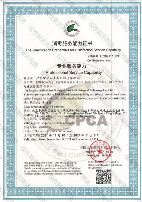 2021年11月12日,北京綠巨人獲得由中國(guó)有害生物防制協(xié)會(huì)頒發(fā)的《消毒服務(wù)能力證書(shū)》,這是繼獲得《出入境檢疫處理單位核準(zhǔn)證書(shū)》之后,北京綠巨人在消毒領(lǐng)域所獲得的又一專業(yè)認(rèn)可。
