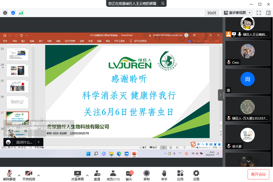 線上方面,北京綠巨人攜手北京市左家莊街道及崔各莊地區(qū),于6月6日當(dāng)天,開展 “6月6日世界害蟲日主題消殺四害講座” 線上培訓(xùn),由沈陽農(nóng)業(yè)大學(xué)植物保護(hù)專業(yè)錢海濤博士主講,傳播科學(xué)防制理念,消除疾病傳播危害,提升轄區(qū)內(nèi)單位、商戶及居民對有害生物防制的正確認(rèn)知、藥物安全管理及應(yīng)用、應(yīng)急處理方法及病媒防制專業(yè)公司如何選擇等消殺知識,共計參加培訓(xùn)人數(shù)達(dá)300人,轄區(qū)單位和居民熱烈響應(yīng),在“專家問答環(huán)節(jié)中”,屏幕上布滿了居民們迫切想要了解的各種消殺問題,錢博士一一解決了他們居家和辦公中苦惱的防制四害的問題。