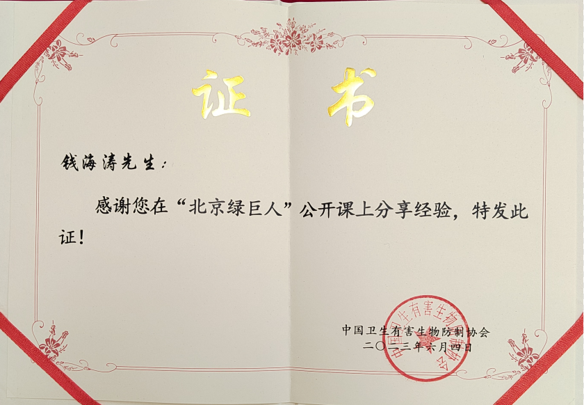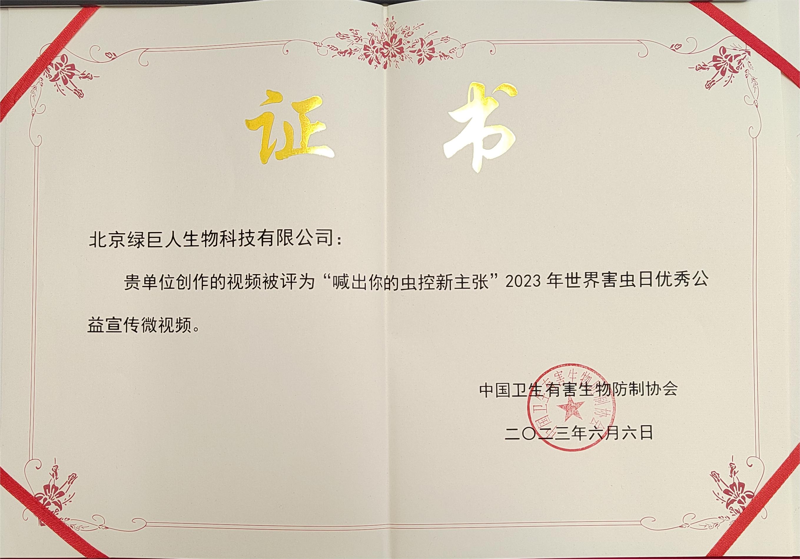 “北京綠巨人”在2023年6月6日世界害蟲日全國公益主場活動中,榮獲“2023年世界害蟲日,優(yōu)秀公益宣傳微視頻”稱號。