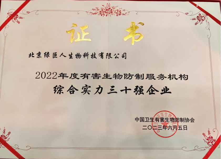 北京綠巨人生物科技有限公司在2023年全國消殺大會上,蟬聯(lián)“年度有害生物防制服務機構綜合實力30強企業(yè)”稱號,贏得了專家、領導單位和客戶的一致好評。“北京綠巨人”已連續(xù)多年獲得本殊榮,是社會各界對北京綠巨人生物科技有限公司在PCO領域的實力和引領地位的充分肯定。